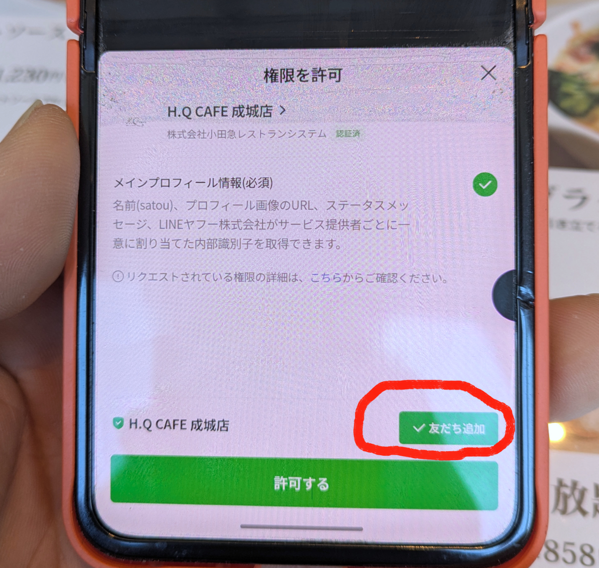 それでオーダーは外食ですっかり定着したスマホ注文。LINEの仕組みを利用しているので、メインプロフィール情報の共有権限を許可しないといけない。ここに限ったことではないけど、これなんとかならないかな~……。そのまま許可するとお店が友達に追加されるので、適宜判断頂きたい。