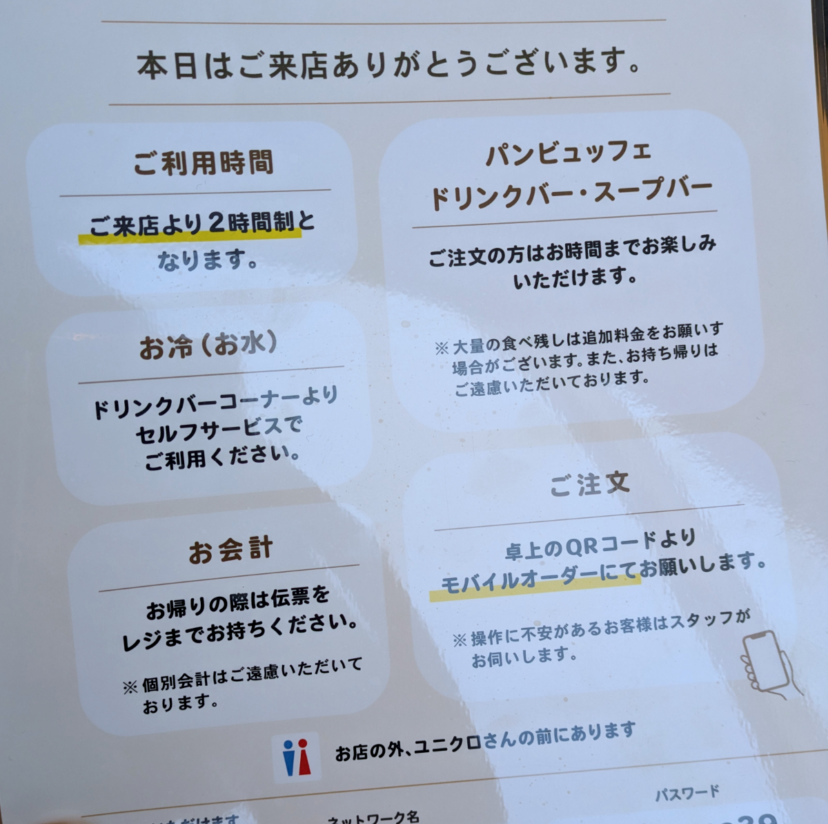 さて入店して席に着くと、まずは食べ放題のルールの説明を受ける。利用は2時間制で、大量の食べ残しについては追加料金が発生するとのこと。特別厳しいわけではなく、一般的なルールではないだろうか。