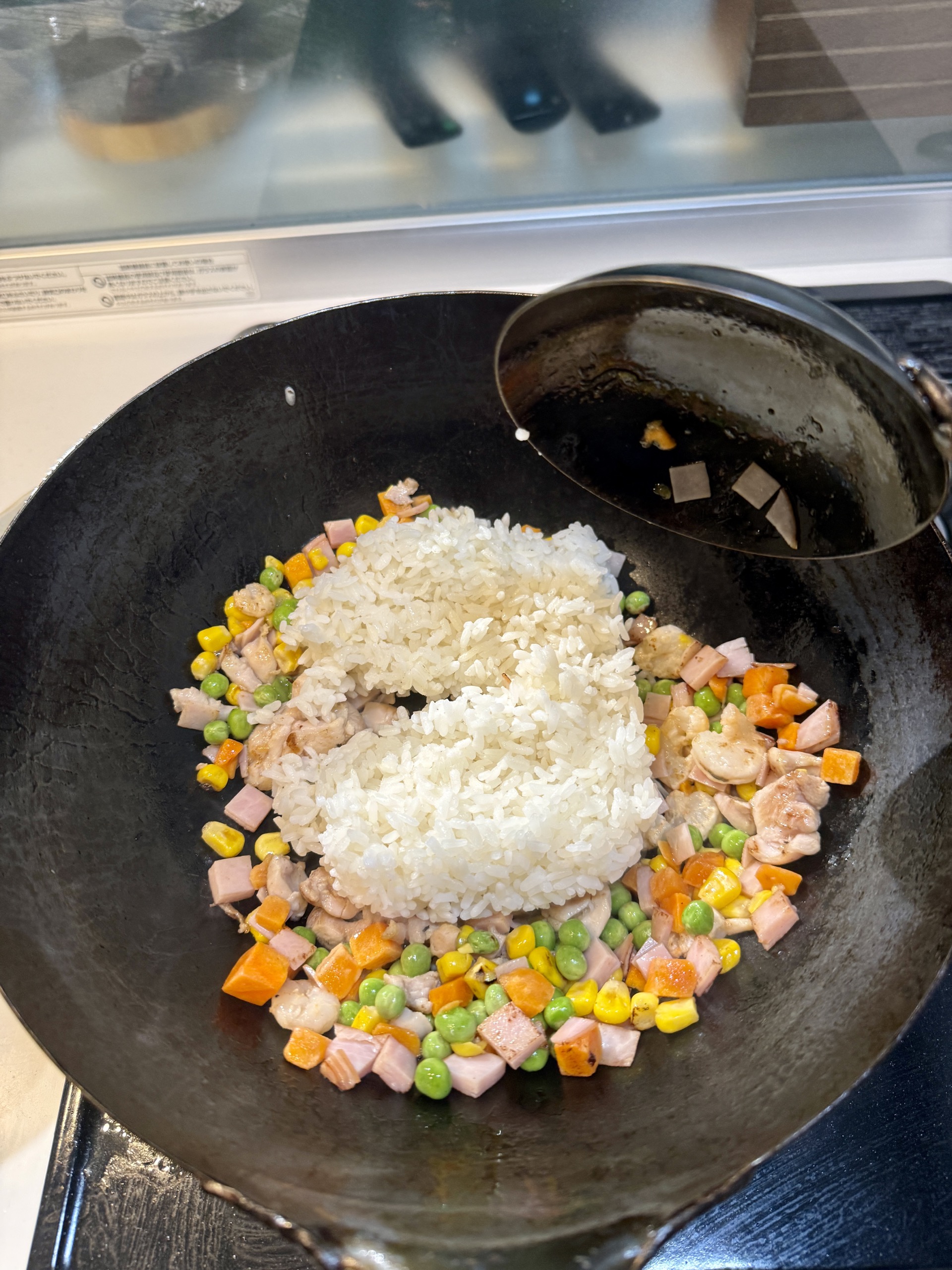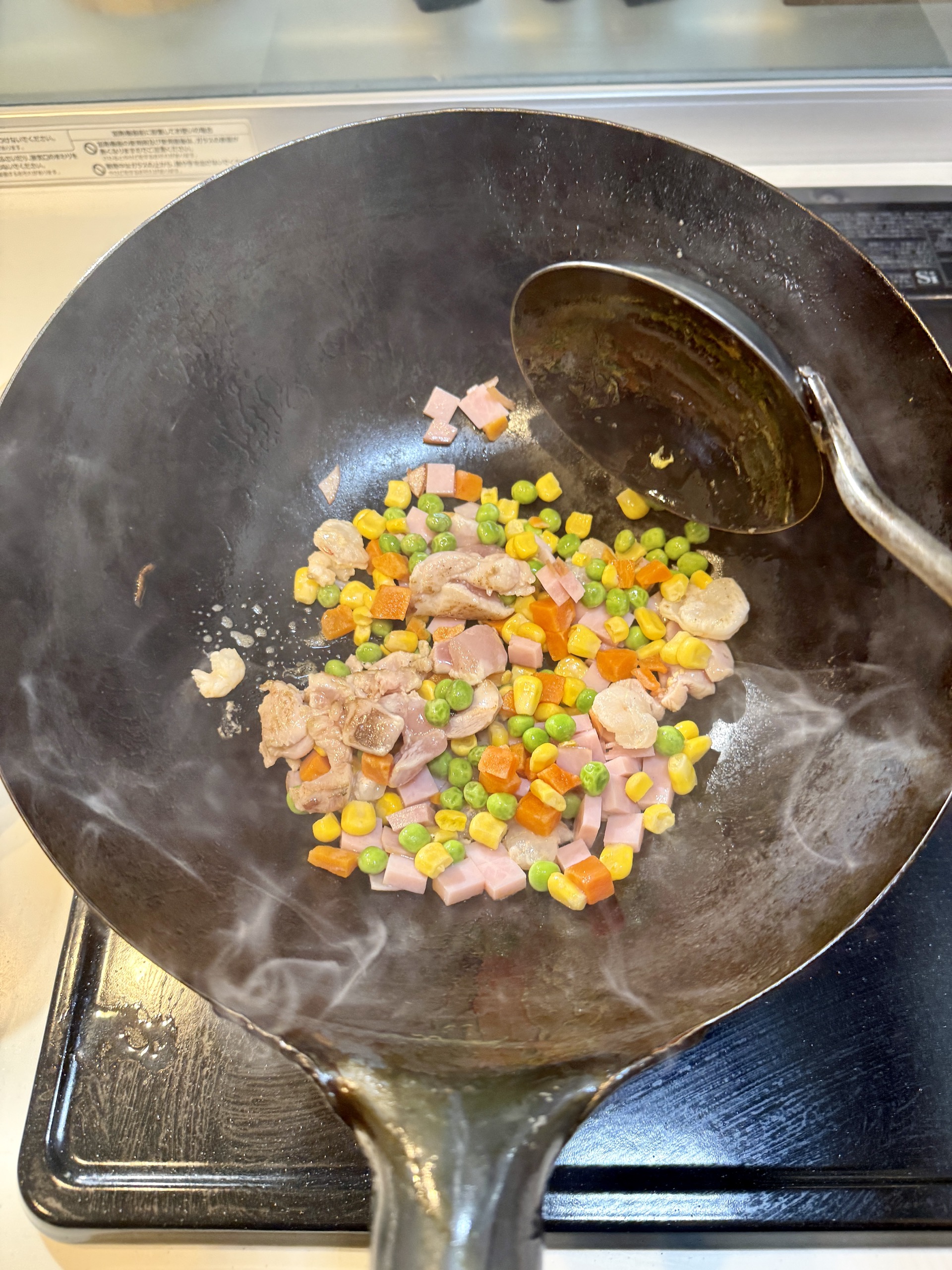 その2:油を入れ直し、鶏肉、エビ、ハム、にんじん、コーン、グリーンピースを入れて炒める。