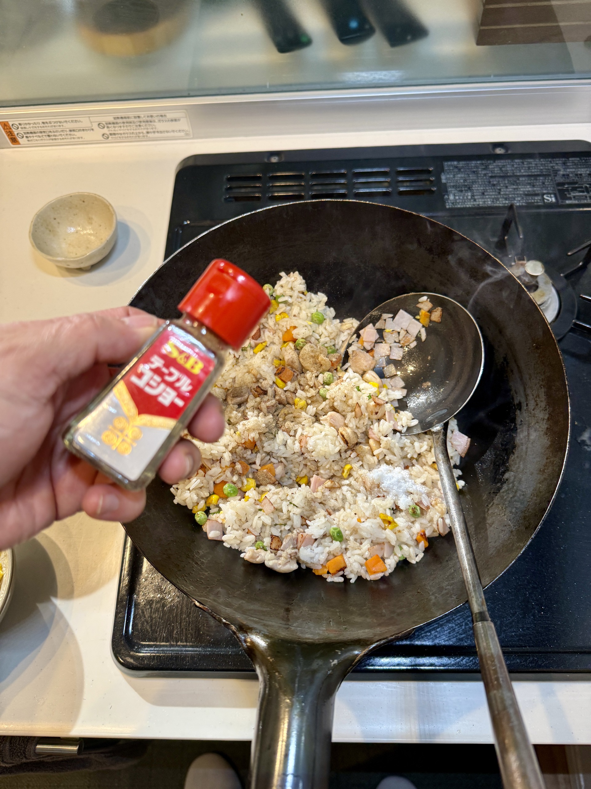 味付け的には、仕上げに回し入れた醤油が功を奏している。これにより、めちゃめちゃ「焼き飯感(日本感)」が増したのだ。最小限の味付けで素材の旨味を最大限に引き出している。