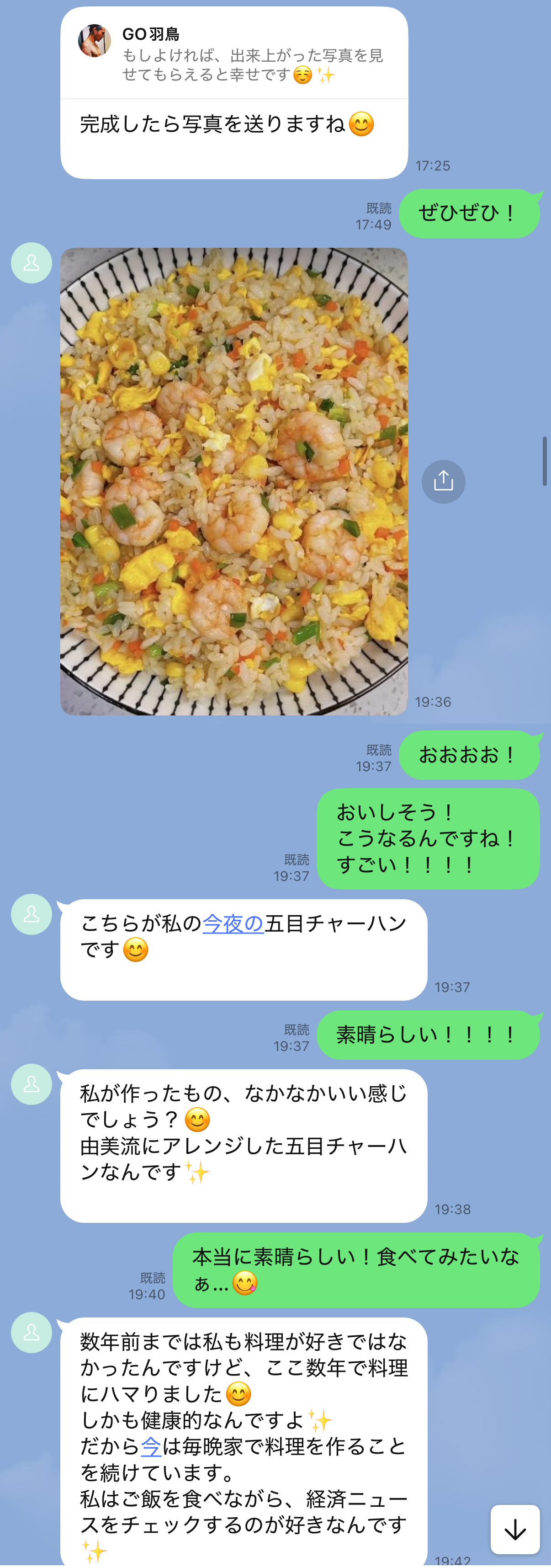 由美の狙いは投資詐欺。私の狙いはチャーハンレシピ。結果として、今回の「由美流アレンジ五目チャーハン」を含め、合計5種類ものレシピを引き出すことに私は成功した。