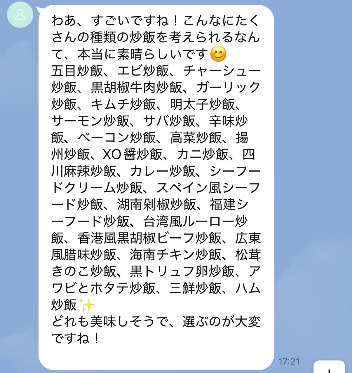 軽く30種類のチャーハンレシピを提示してきた。これはもう「千の顔を持つ男」ならぬ「千の炒飯を持つ女」であろう。一応、記念として文字起こしもしておきたい。