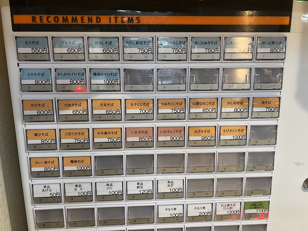 そして、確かに昼時人が集まってくる。行列店だ。券売機を見ると、もりそばが税込550円で一番高い鴨南そばは税込1000円。立ち食いそば価格の上位帯という感じである。そんなわけで、もりそばの中もり(100円)を注文してみたところ……