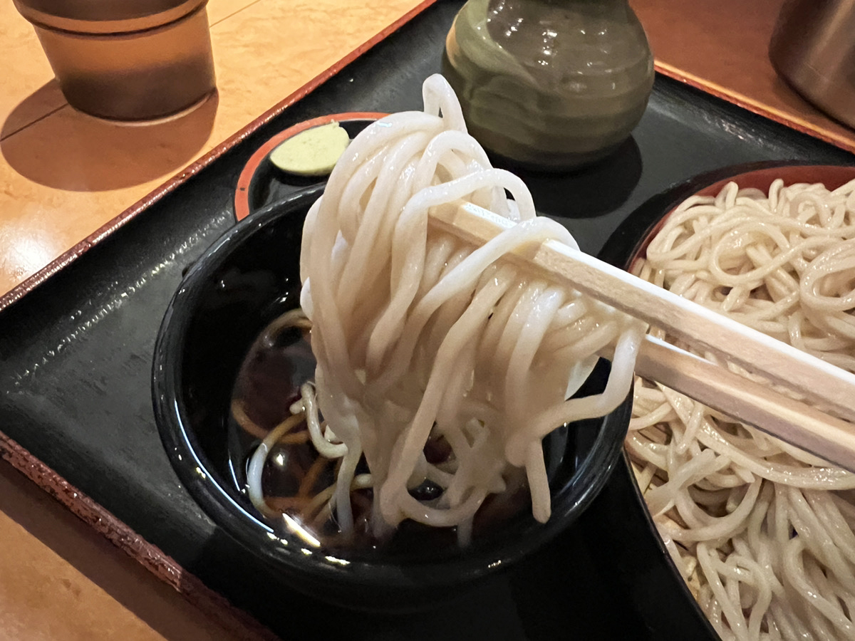 とりあえずひと口食べてみたところ、そばは食感に個性を感じるタイプ。立ち食いそばによくあるボソボソとした食感じゃなく独特の弾力があるのだ。歯がバウンスするような食べ心地は好き嫌い別れそうだが、喉ごしが良いのでスルスル入る。