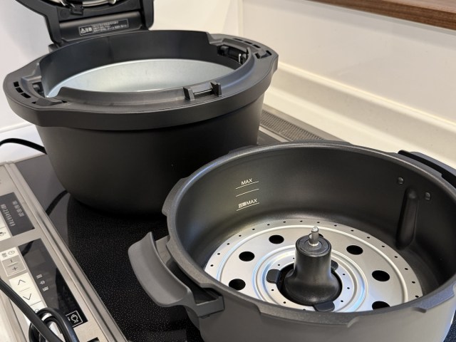 本体はおよそ30cm四方、約8kgの重さがあり「かなり大きい」という印象だ。ファミリーサイズの炊飯器を、さらに二回りくらい大きくしたサイズ感。事前に設置場所やコンセント位置を考えておくのが必須だ。同梱物はシンプルで、内鍋と羽根、蒸し料理用の板で構成されていた。