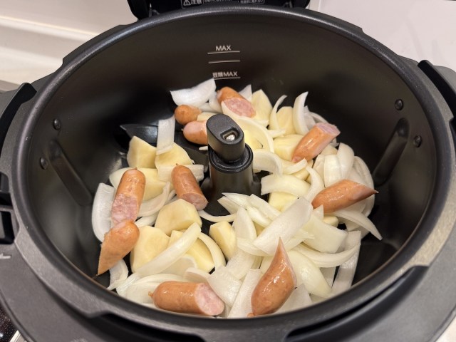 レシピは専用アプリまたは専用サイトで確認できる。所定の材料を投入し……と思ったらベーコンがなかったのでウィンナーにする。ボリューム感を出すため、勝手にタマネギも足してみた。レシピとは違うが、まぁいいだろう。