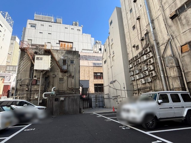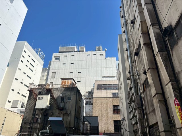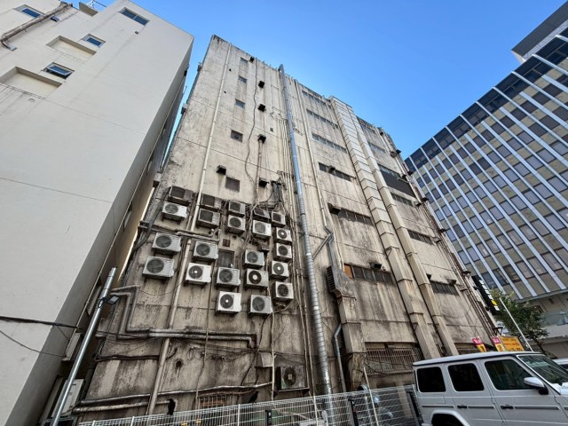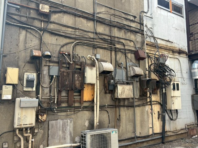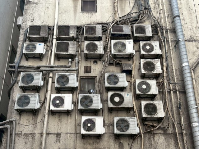 目の前に現れたのは、古いビルの外壁にむき出しで設置された、大量のダクト、銀色の太い配管、びっしり並ぶ室外機。なるほど……たしかにこれは、ビルの “裏側” そのものである。