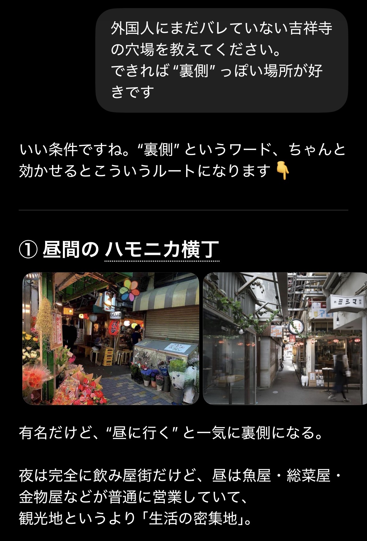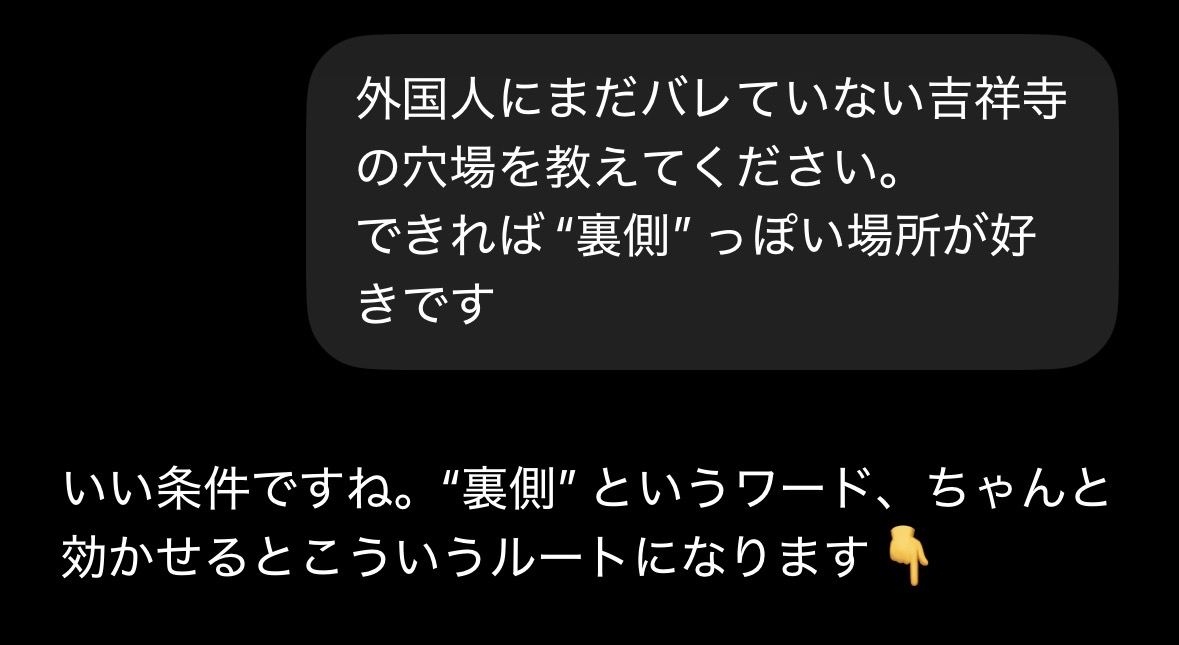 先日、久しぶりに吉祥寺へ行く機会があった私は、ChatGPTに「外国人にまだバレていない吉祥寺の穴場」を聞いてみた。個人的に潜入や裏側が好きなので、「裏側」というキーワードも追加してみる。