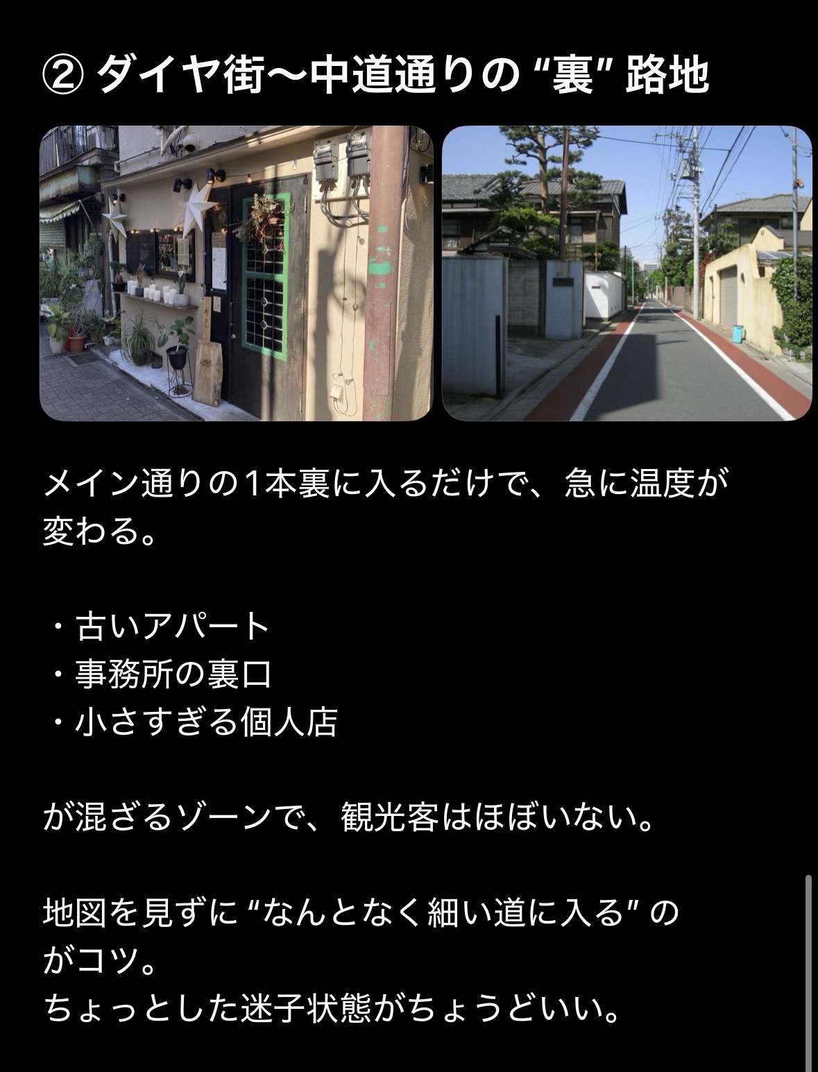 穴場を探しに来たはずなのに、行ってみたい場所が多すぎるな……と思いつつ、ChatGPTが案内した場所へ向かうことにした。ちなみにChatGPTが最初に出してきたのは、ダイヤ街やサンロードの裏道、昼間のハモニカ横丁などだった。