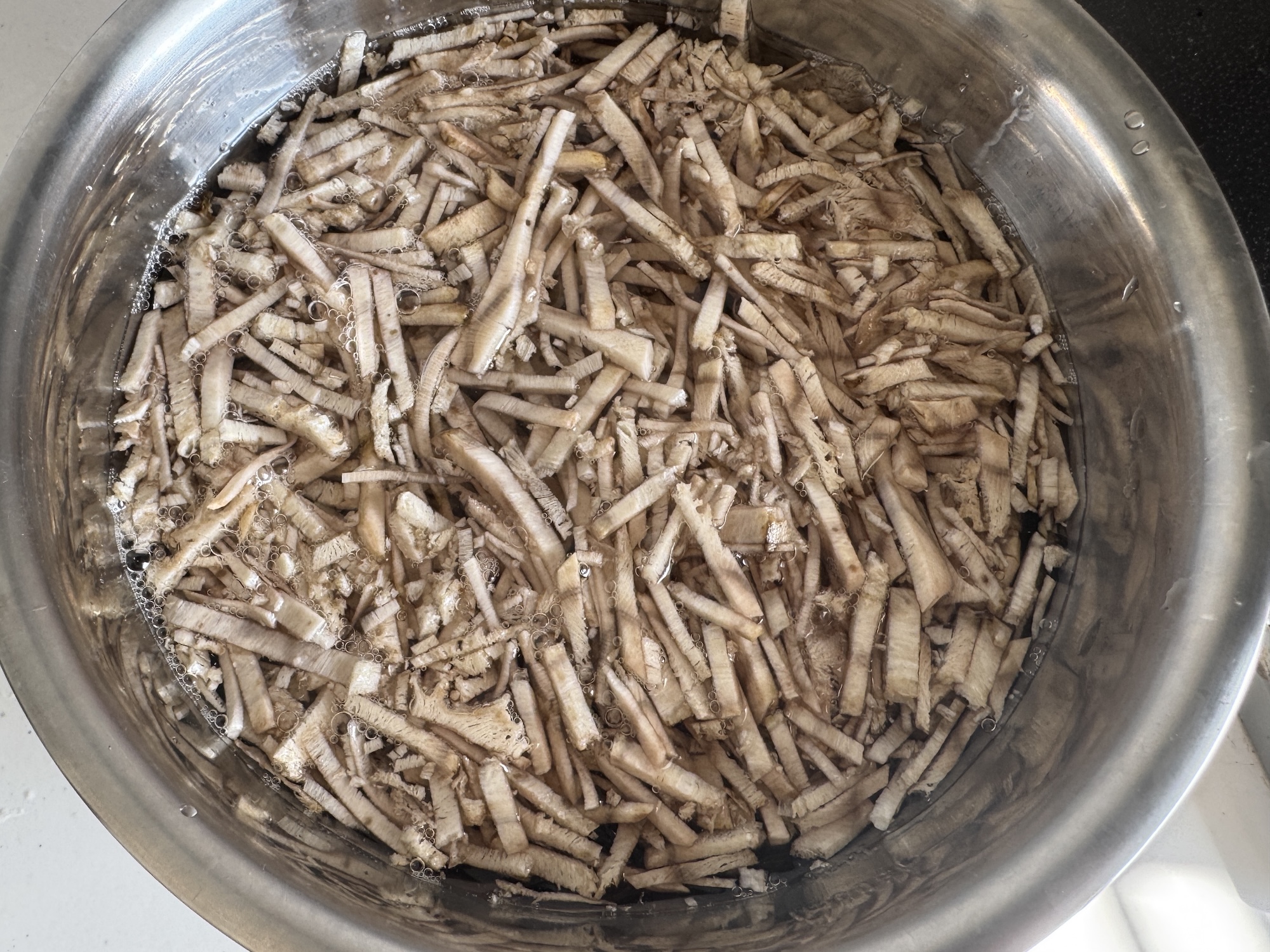 とはいえ、圧倒的ジャンボであることに変わりはない。ノーマルゴボウほどスムーズにはいかなかったが千切り風にしてアク抜き。