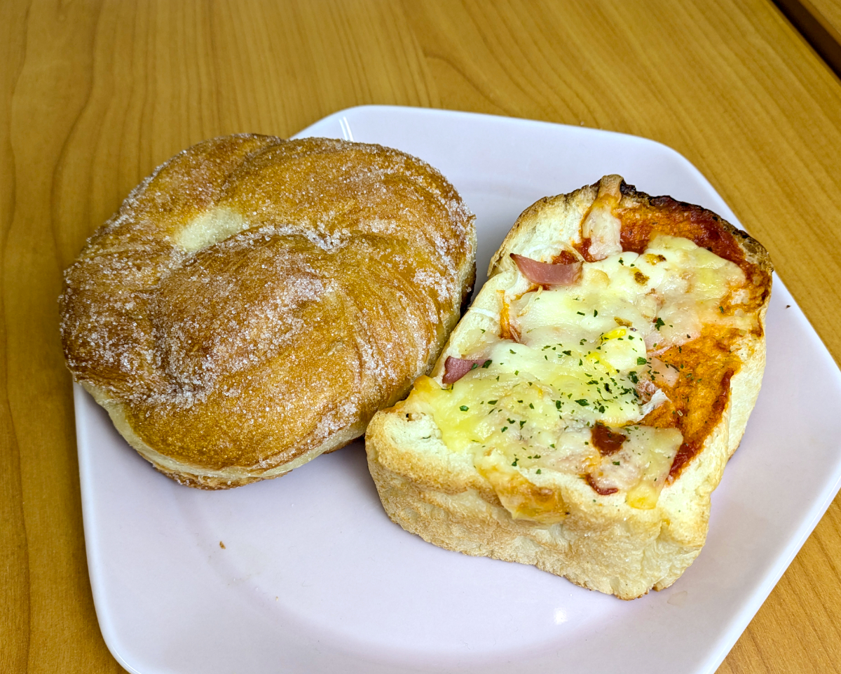 自社製造ゆえなのか、価格は意外と安い。たとえば今回購入した「ピザトースト」は税別110円。「シュガードーナツ」は税別120円である。