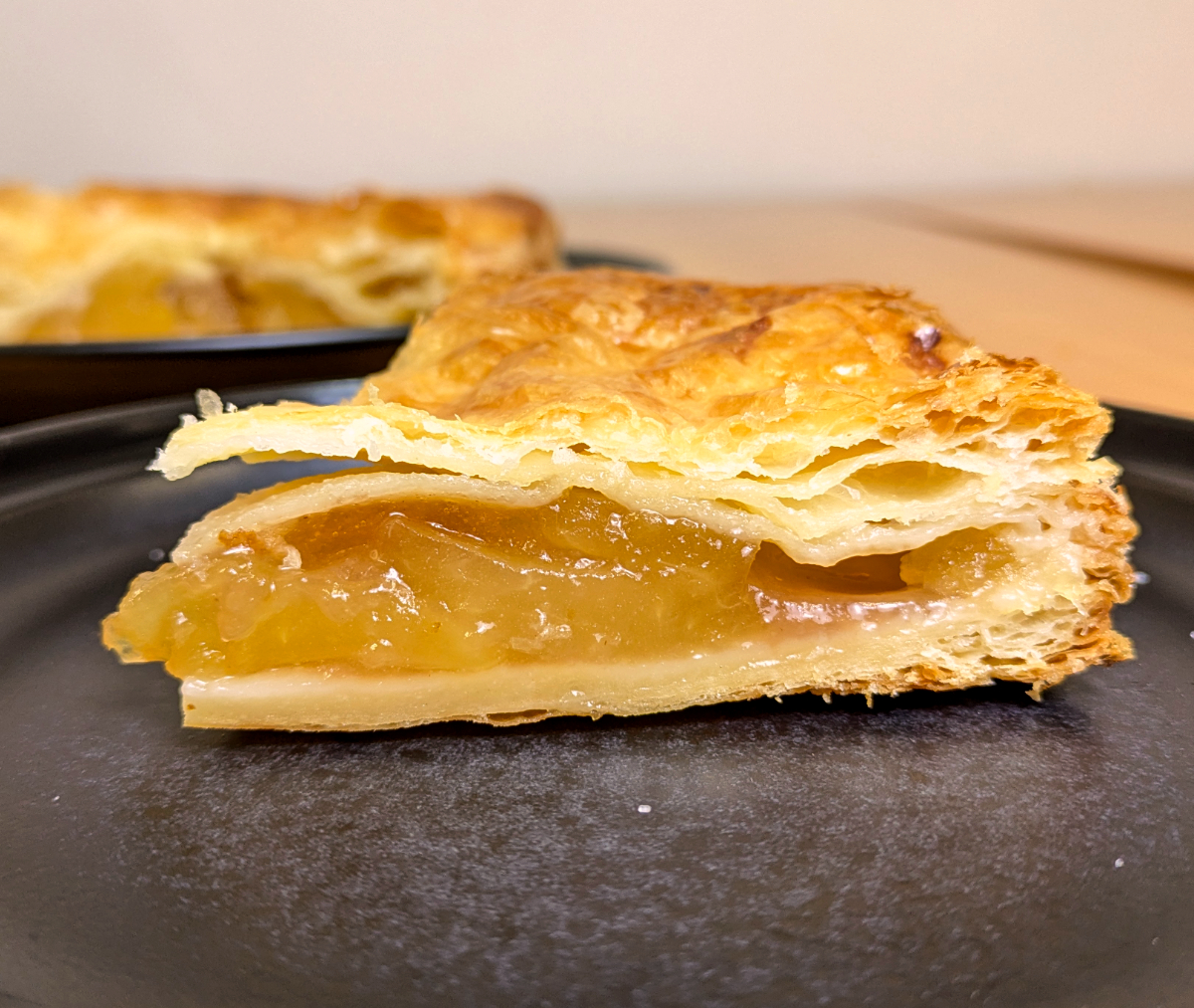 さっそく切り分けてみる。ナイフを入れるとザクっと弾けるような音がして、中の艶やかなアップルフィリングが顔を覗かせる。もう断面からして美味そうだ。