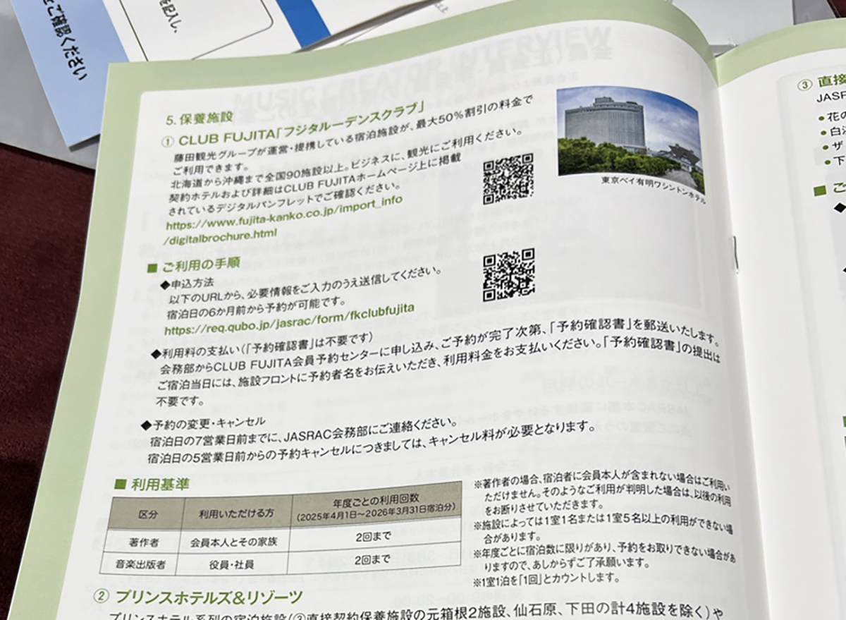 『JASRAC NOW』によると、JASRACの保養施設は専用の建物があるわけではなく、利用契約を締結しているホテルやホテルグループを優待料金で利用できるというもののようだ。ホテルグループは『藤田観光グループ』と『プリンスホテル&リゾーツ』、それと別に直接契約の施設が7施設ある。