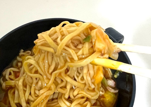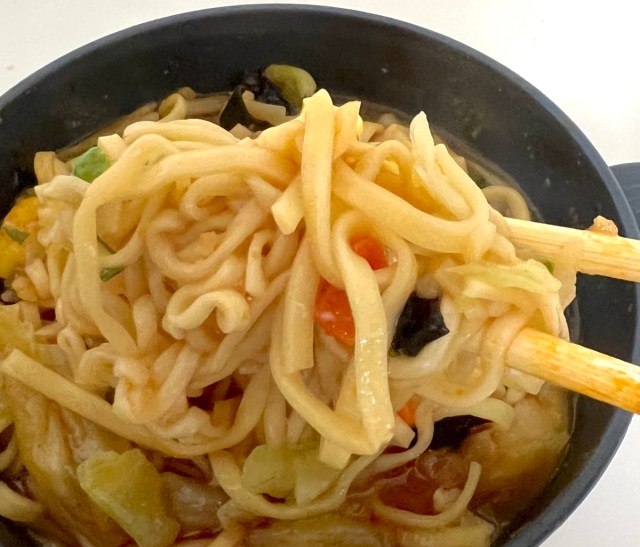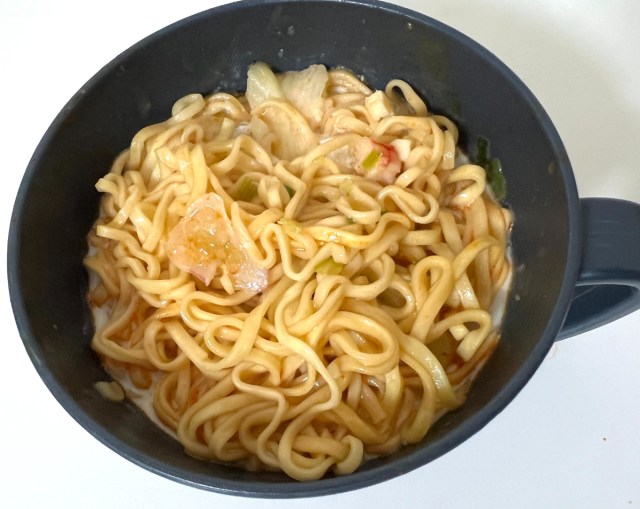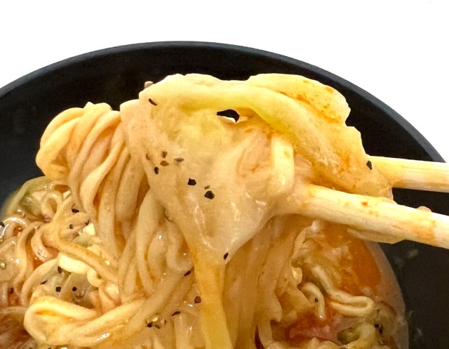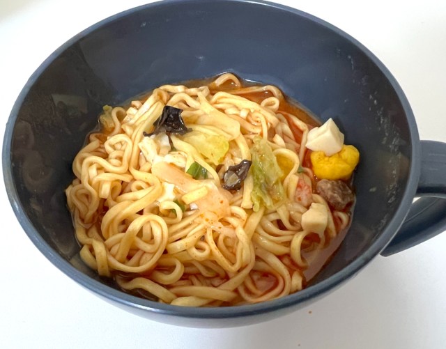 一口すすると……中本の辛さがかなりマイルドになっている。シーフードヌードルのクリーミーなスープが辛味をうまく包み込んでいて、これはこれで全然アリ。「中本の辛さは好きだけど、ちょっと辛すぎて……」という人にはすごくおすすめかもしれない。