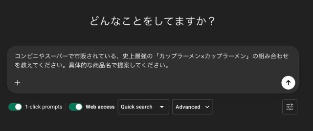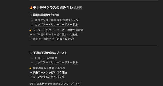 まずは「コンビニやスーパーで市販されている、史上最強の「カップラーメンxカップラーメン」の組み合わせを教えてください。具体的な商品名で提案してください」とプロンプトを投げてみた。