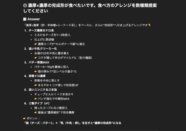 さらに「脂(チーズ・バター)」+「乳(牛乳・卵)」を全部足すと「濃厚の完成形」になるという究極のアレンジまで提案してきた。なるほど、ChatGPTもなかなか攻めている。