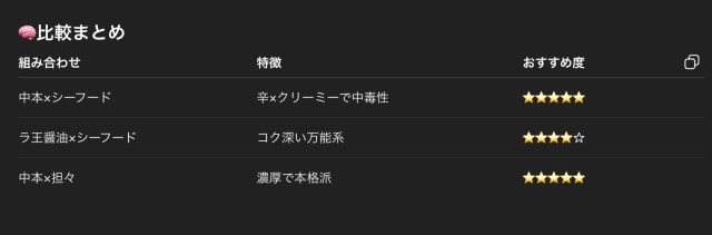 するとChatGPTが返してきた回答がこちら。3種類提案してきた中で、「蒙古タンメン中本×シーフードヌードル」は辛さとクリーミーさで中毒性があるとのこと。