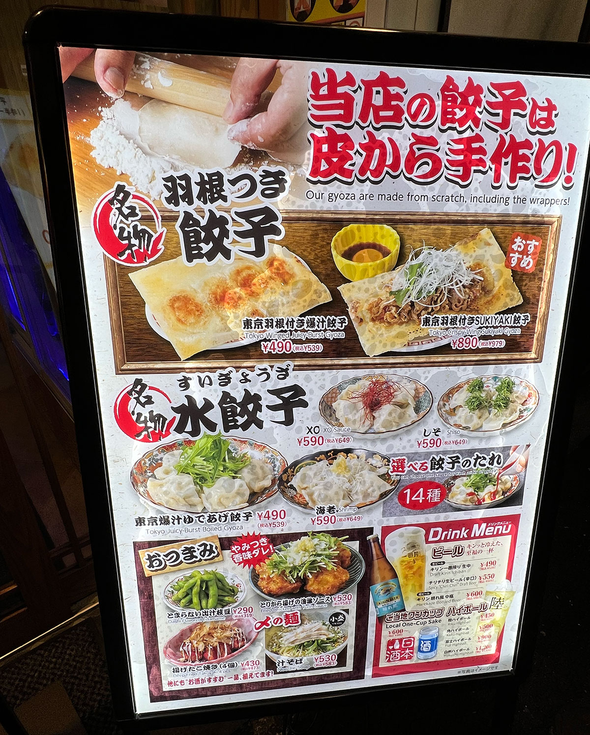 さらにさらに、置いてある料理もお酒に合うものが多い。メインである餃子だけでも「東京羽根付き爆汁餃子」「東京羽根付きSUKIYAKI餃子」「東京爆汁ゆであげ餃子」と何種類も揃っている。
