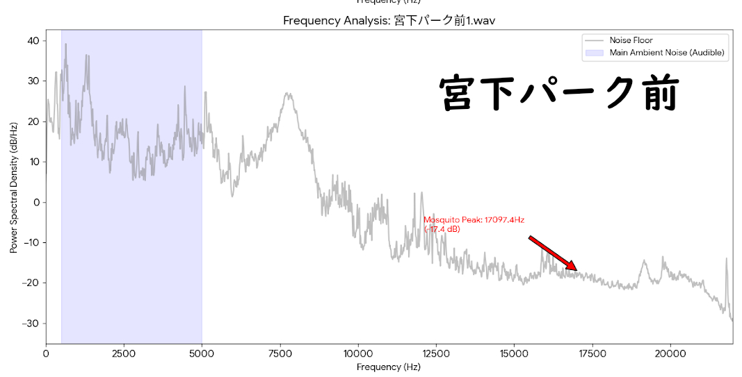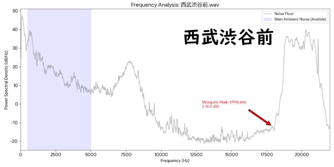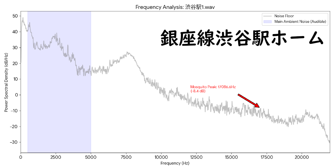 聞いたのは気のせいだったか? それとも本当にモスキート音が鳴っていたのか? 確信が持てなかったゆえに途中何カ所かで録音しておいたわけだが、その音を生成AI「Gemini Pro」に聞かせてみたところ、銀座線渋谷駅ホーム・宮下パーク前・西武渋谷前のそれぞれでモスキート音と思われる音が出ているという解析結果だった。それぞれ「17086Hz」「17097Hz」「17915Hz」としている。