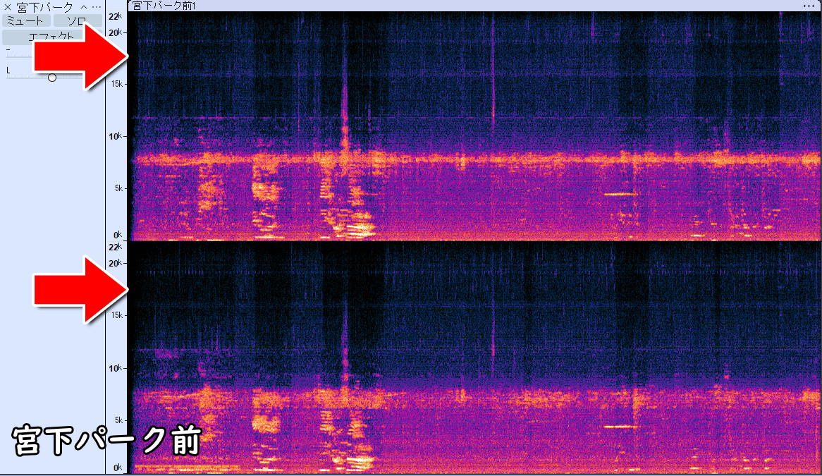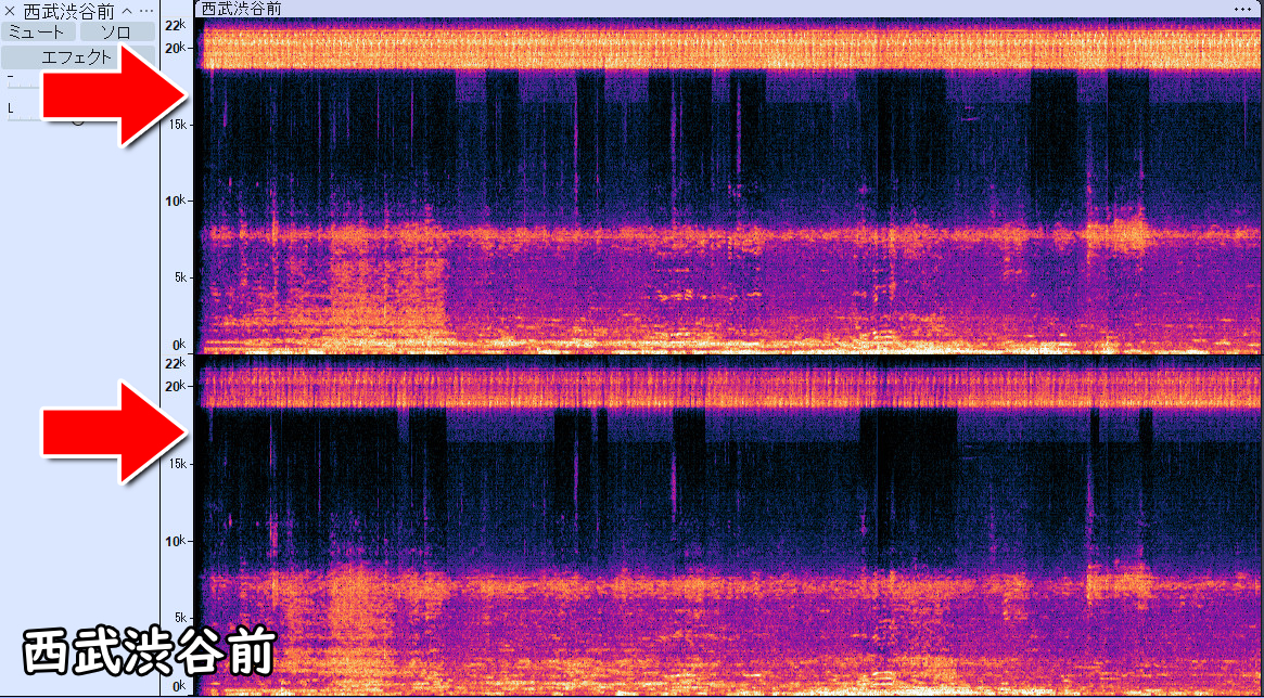 そして最後に西武渋谷前は、20kHzの帯域に真横にハッキリとした太い線が出現した。先ほどの2カ所とは比べ物にならないほど大きな音が鳴っていたことがわかる。