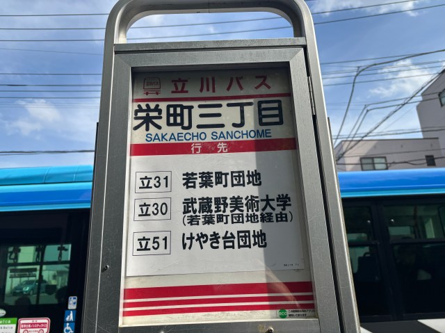 立川駅北口の6番乗り場からバスに乗って、栄町3丁目バス停を降りてすぐ!