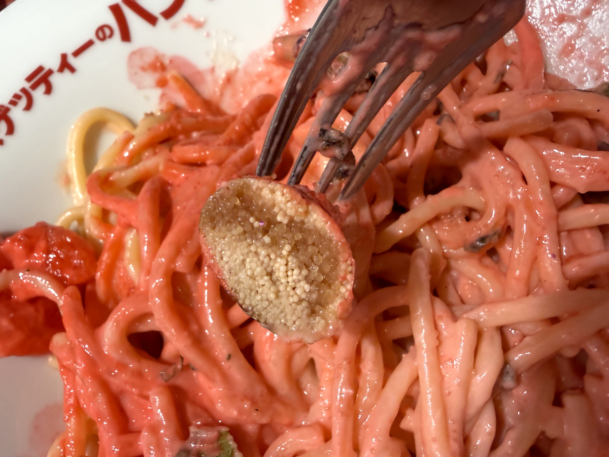 そのピンク強度はたらこスパゲティの常識を遥かに超えた “ショッキングピンク” と言っていい。受け止め方は人それぞれだろうが、少なくとも私は「おいしそう!」とは思えなかった。