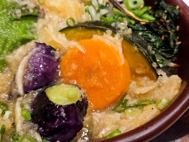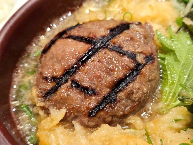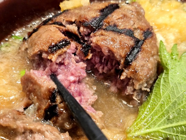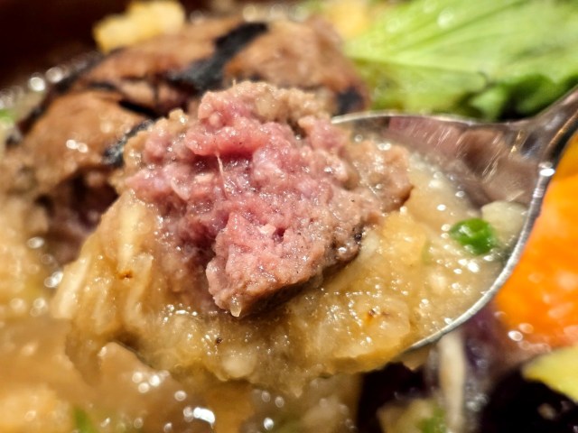 ただ、まわりの出汁やみぞれと一緒にハンバーグを食べると一気に印象が変わる。水分を含んでよりやわらかくなったハンバーグが、甘みのあるみぞれ出汁と想像以上に合うのだ……! スパイスの効いたハンバーグと出汁なんて喧嘩しそうなもんなのに、うまいこと調和しているぞ!?