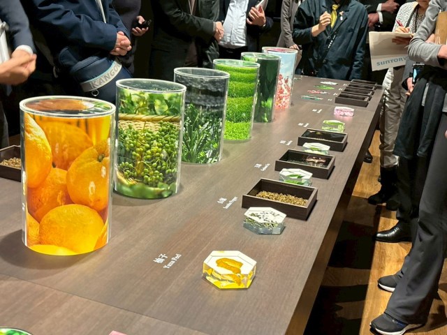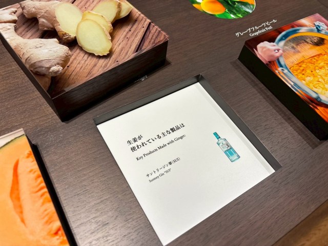 柚子や玉露などのさまざまな原料素材が並び、見た目や香りなどで楽しめる設計。