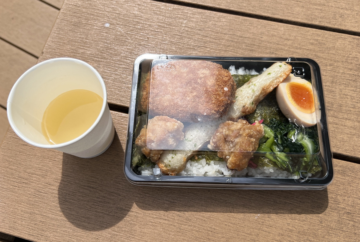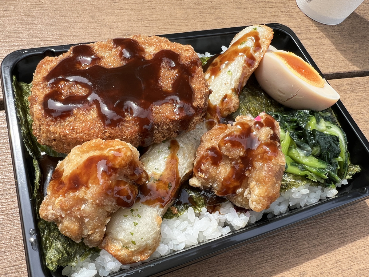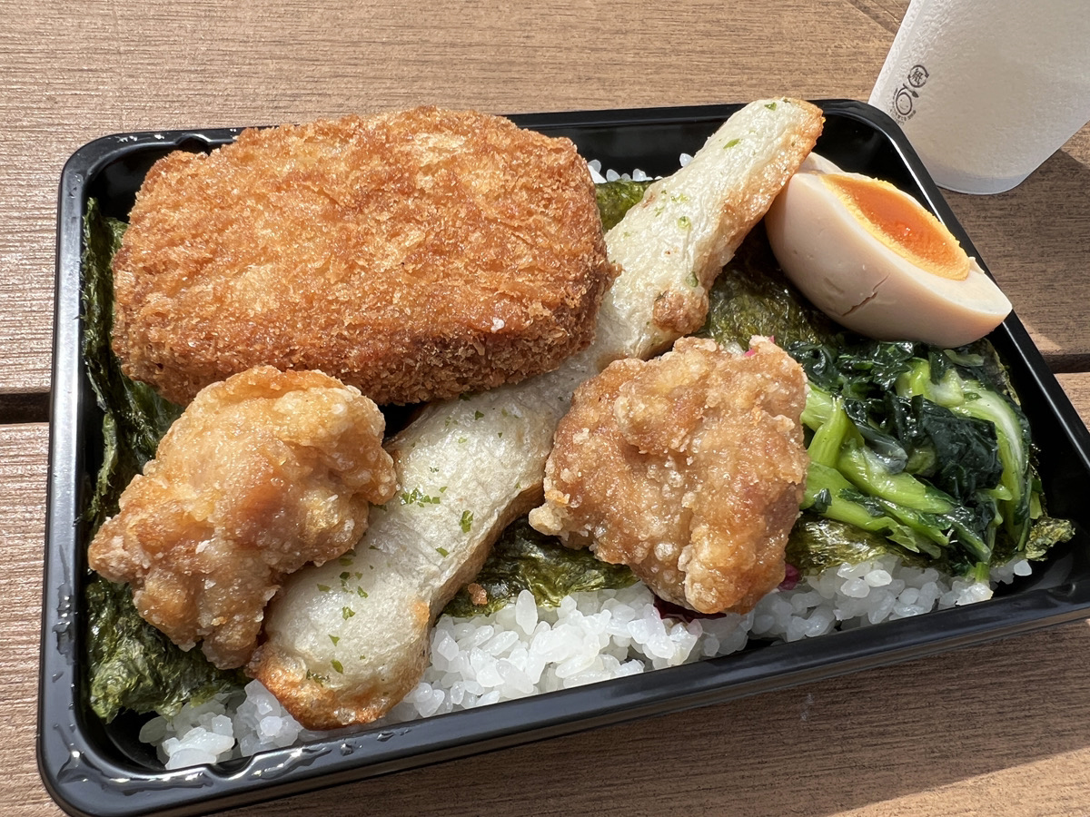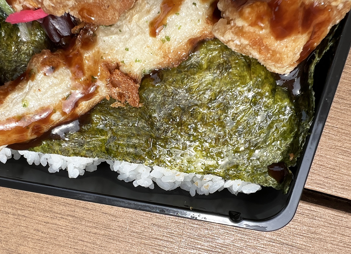ベンチに座ってフタを開けてみると、海苔ご飯にライドオンするのは、ちくわ天、鶏唐揚げ2個、メンチカツ、ゆで卵というラインナップ。海苔弁としては豪華だけど、1100円という価格に釣り合っているのかはまだ納得できない。そこで食べてみたところ……