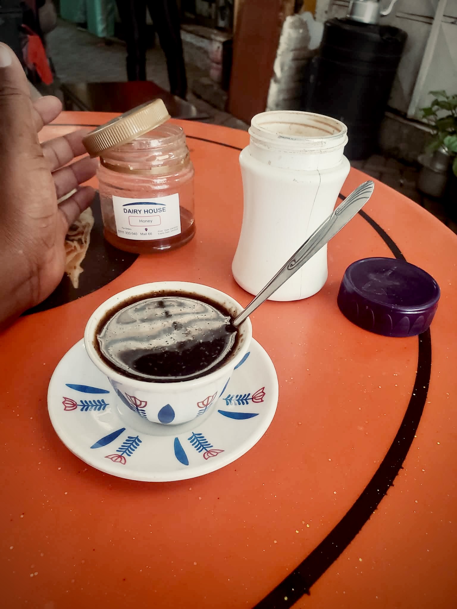 「ハチミツとショウガを入れてもいいよ。でもこのコーヒーはとても強いから、1杯だけにしておいた方がいい」