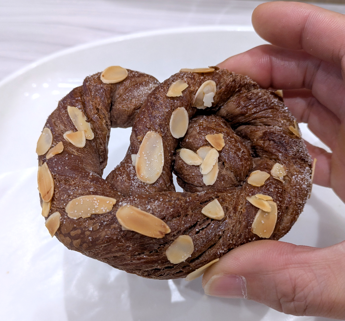 続いてチョコクリンゲル。「クリンゲル」とはデンマークのデニッシュで、何層にも重ねた生地にマジパンペーストをのせて焼き上げたペイストリーだ。表面はふんわり、中はサックリとした食感が面白い。