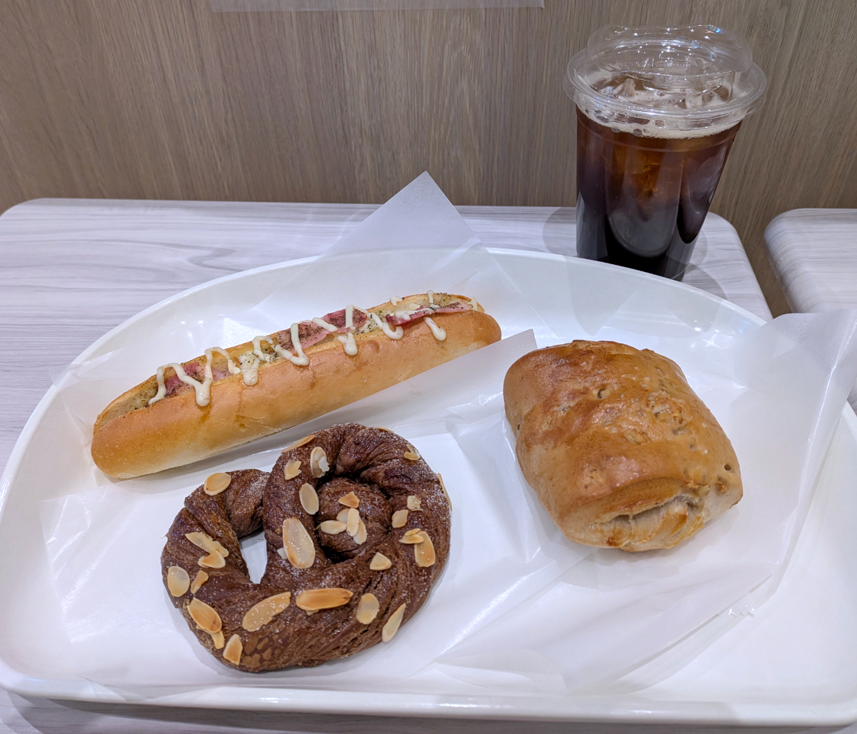 悩んだ末に購入したのは「ベーコンポテトドッグ」(税別260円)、「チョコクリンゲル」(税別170円)、「塩バタークルミパン」(税別210円)の3品。加えて「アイスコーヒー」(Lサイズ税別210円)を持って席についた。
