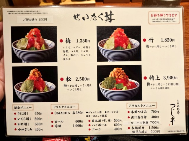 通されたカウンター席でメニューを見て一安心! 何がって、「ぜいたく丼」のみで勝負しているスタイルがあの頃のまんまだったのだ。値段ごとに具材が変わっていくこのシステム、当時はけっこう斬新だったんだよね。