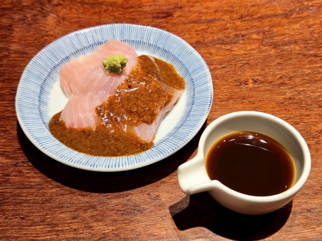 最初に出される刺身はブリ(ハマチ)かタイのことが多いみたい。しょうゆ風味のゴマだれがさっぱりしたお刺身に合う!