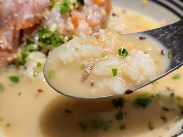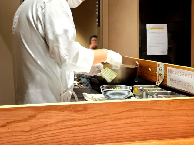 そして、残りが3分の1ほどになったタイミングで板前さんに声をかけると、丼に特製の鯛だしを注いでもらうことができるぞ……!