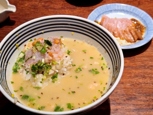 残しておいたお刺身をのっければ海鮮茶漬けの完成だ! 1度で2度おいしい、とはまさにこのこと!
