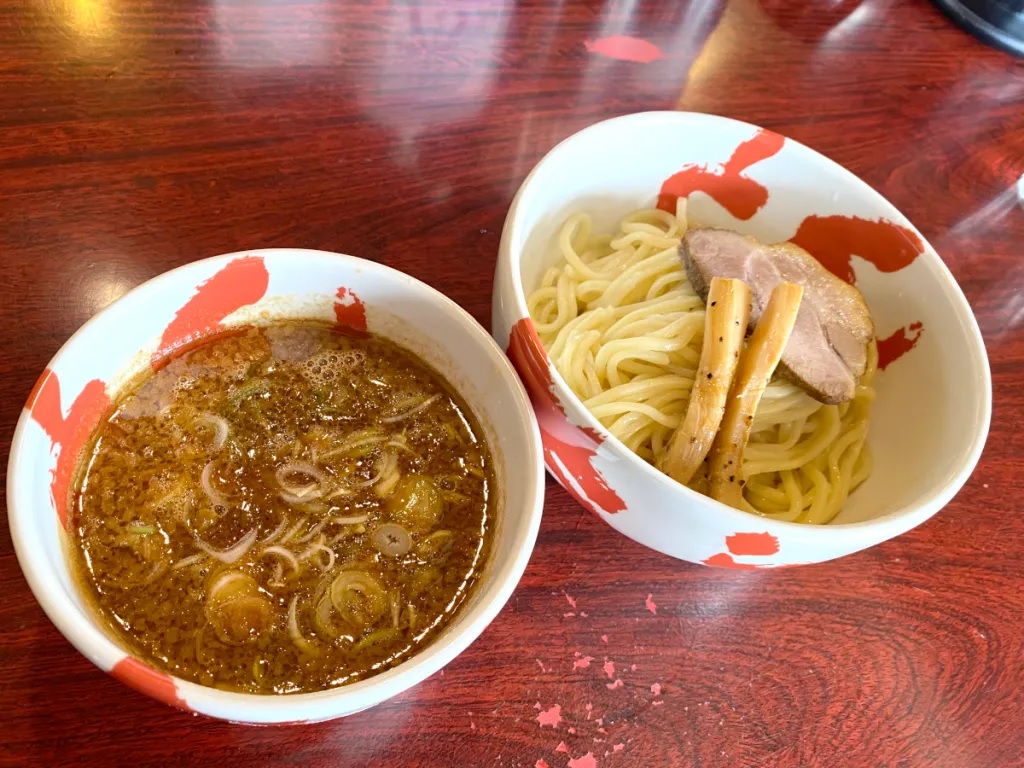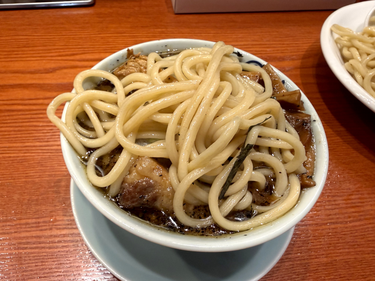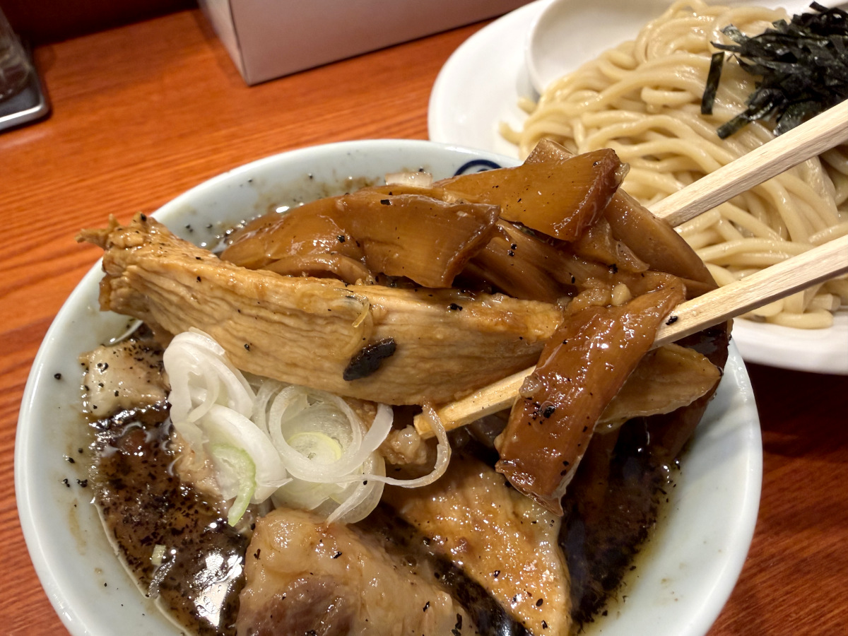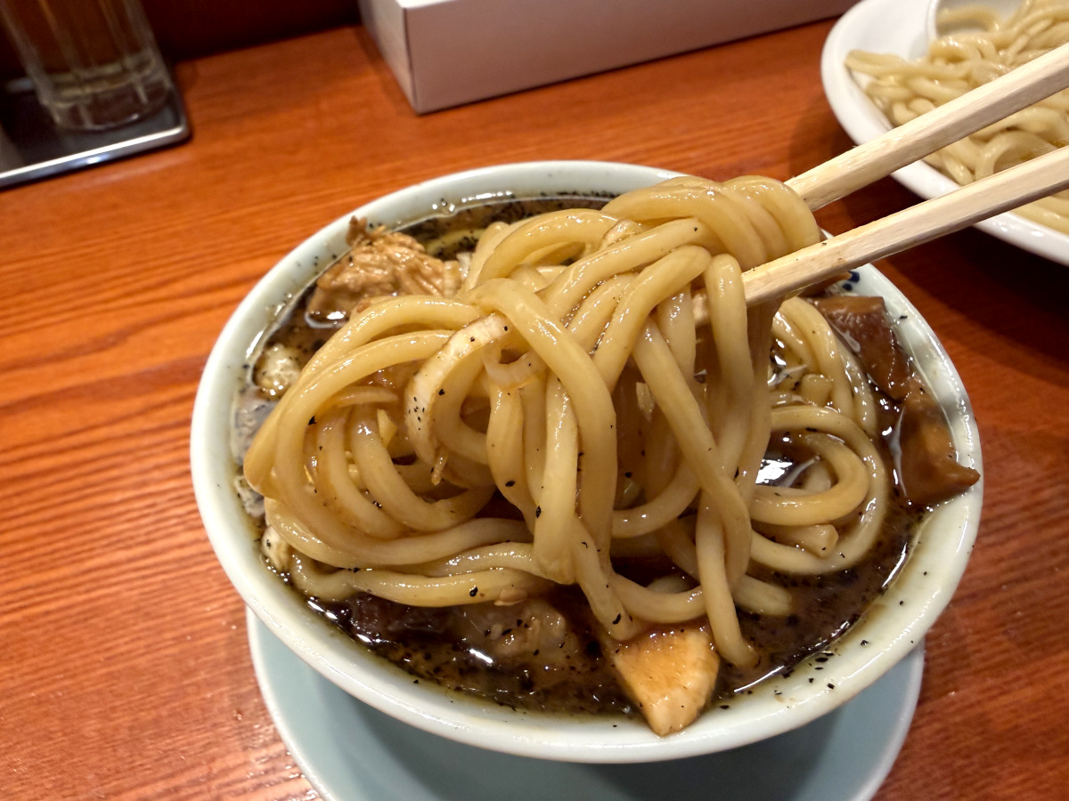麺が器に入りきらないほど具がモリモリのつけ汁も印象的で「これこれ!」といった感じ。中太ストレート麺はのど越しもワシワシ感も最高で「THE・王道つけ麺」と感じずにいられなかった。