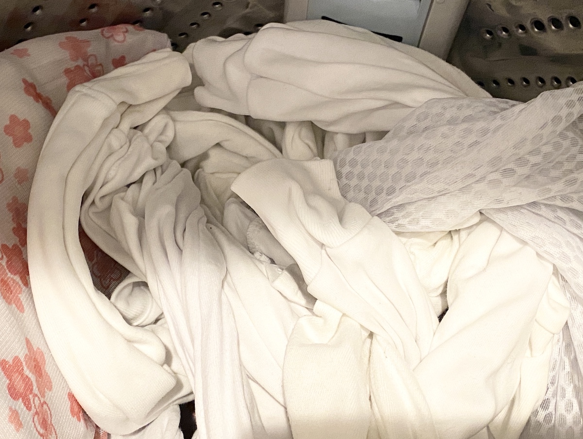さて、それではさっそくオキシ漬けスタート。漂白剤「オキシクリーン」をお湯(洗濯表示に表記されている最高温度)に溶かし、我が家の汚れた白シャツを片っ端からぶっ込んでみた。