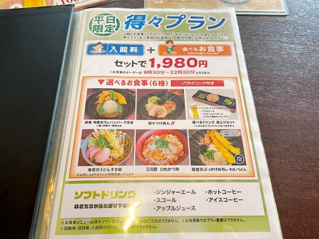 食事はハンバーグ定食やカツ丼など6品の中から選べるという。どれもウマそうだが、当然ここはアルコール付きの『湯上りセット』をチョイス。