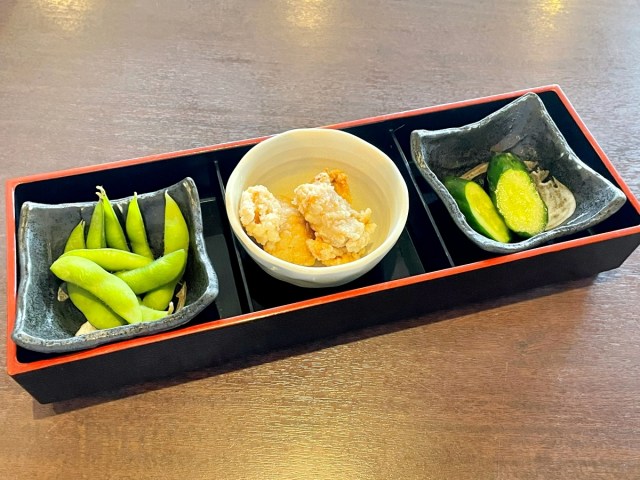 そこへタイミング良く食事も運ばれて来た。枝豆、キュウリの漬物、そしてから揚げの三点盛り。サウナ後のツマミとしてこれ以上ない布陣である。