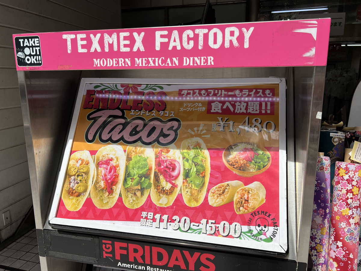 ワタミ系列のメキシコ料理屋である『TEXMEX FACTORY』。タコス食べ放題が人気を呼び、ランチタイムの渋谷でオープン前から行列となっている。タコスもタコライスもポテトもサラダも食べ放題でドリンクバー付きと、平日ランチのコスパが高すぎるから話題になるのも納得だ。