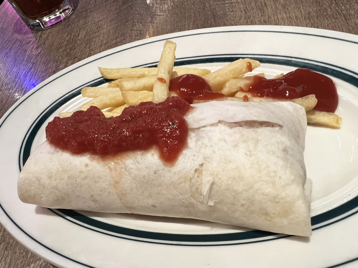 豪快なサイズが出てきた。口いっぱいに頬張れるかなりしっかりしたブリトーである。チキンはローストチキンでコロコロした塊が入っており、プリッとした食感とジューシーさが良い。