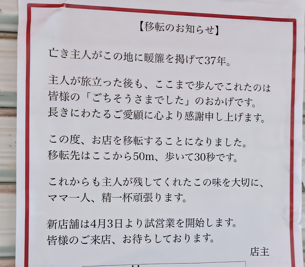 この度、お店を移転することになりました。移転先はここから50m、歩いて30秒です。これからも主人が残してくれたこの味を大切に、ママ1人、精一杯頑張ります。