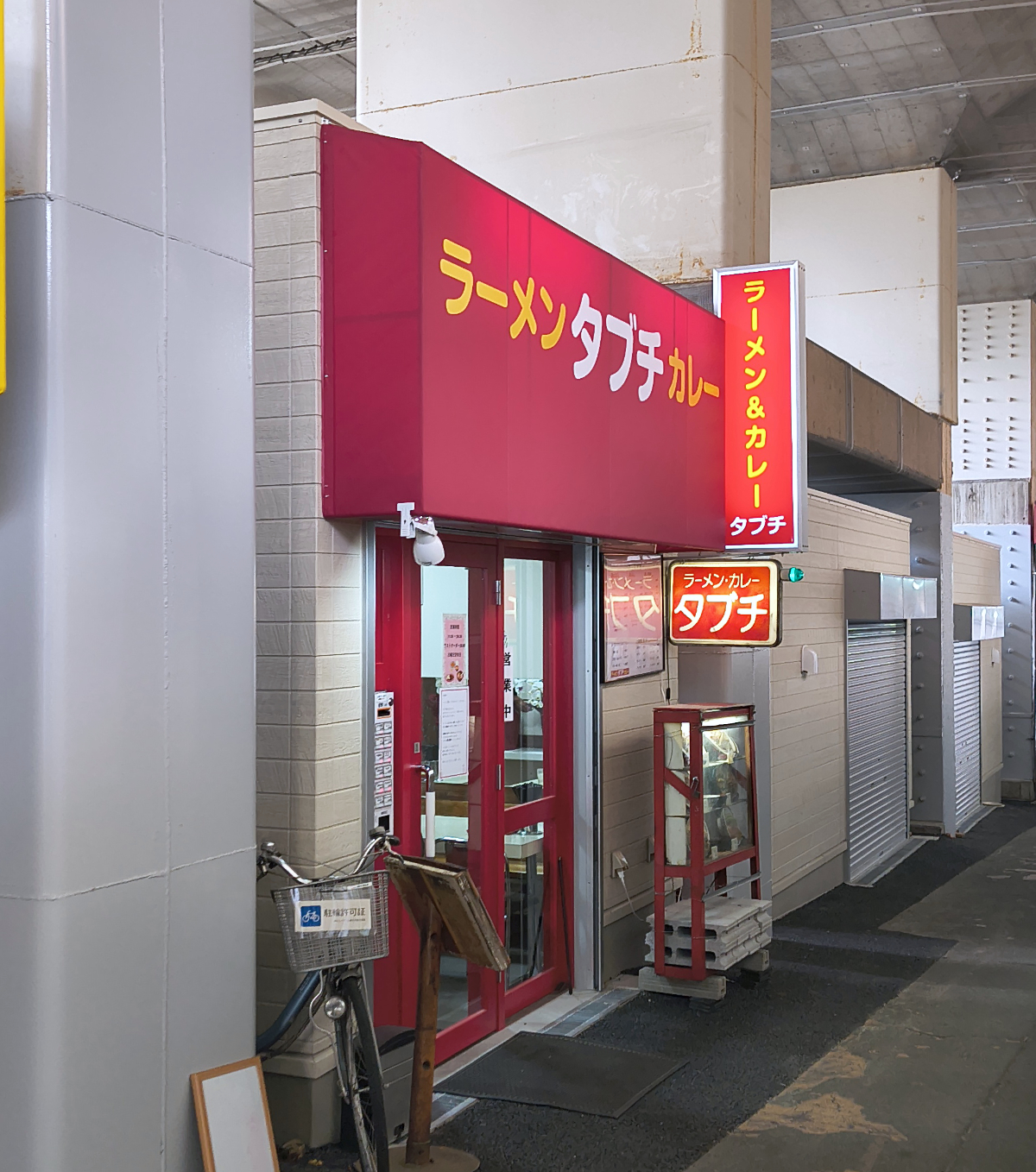 しばらく歩くと赤い看板が見えてきた。赤地に黄色の文字で「ラーメン & カレー」、いつものタブチだ。看板はいつも通りだけど、お店の様子はいつもと違う。