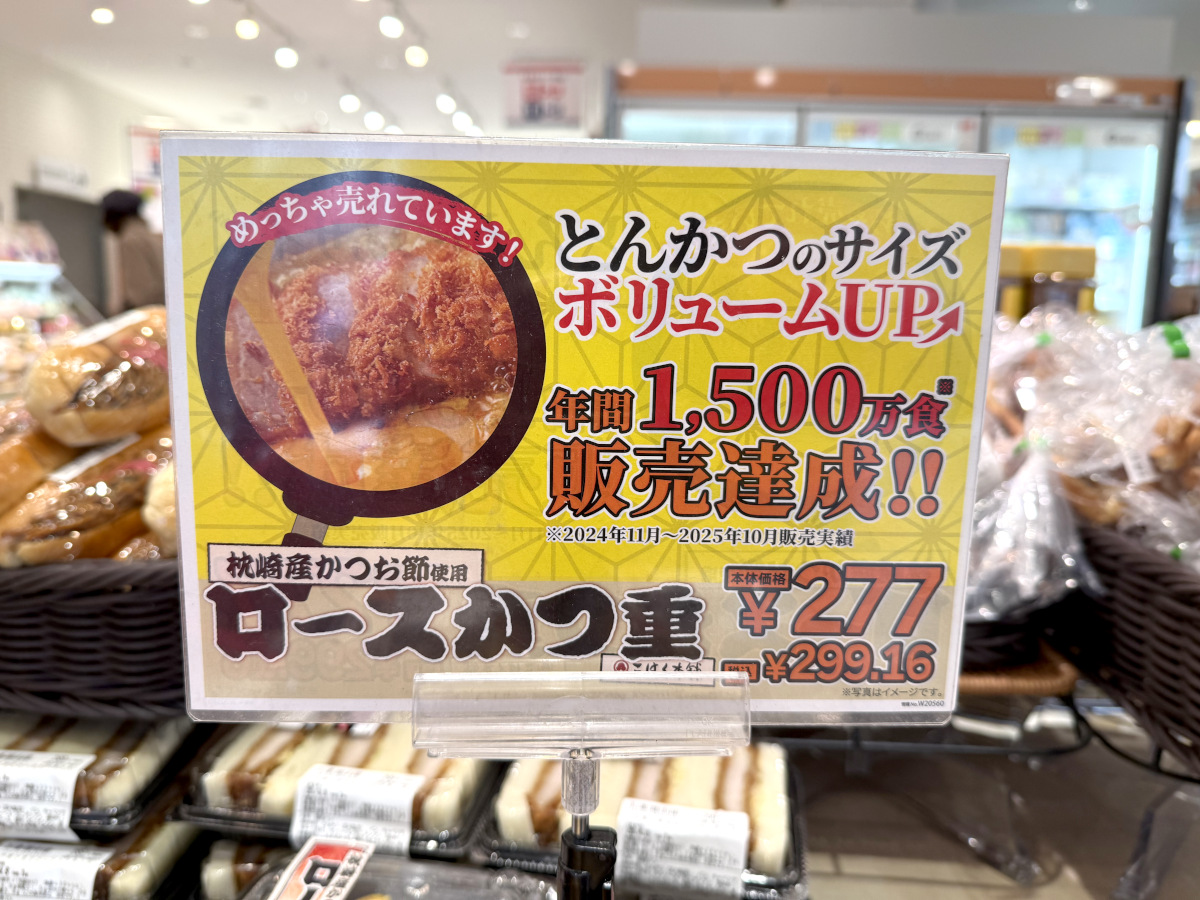 売り場にはロースかつ重が山積みにされており「年間1500万食達成!!」と誇らしげに記載されていた。こんなご時世だもの、ロースかつ重が299円なら飛ぶように売れるに決まってる。それでも1500万食は立派だ。