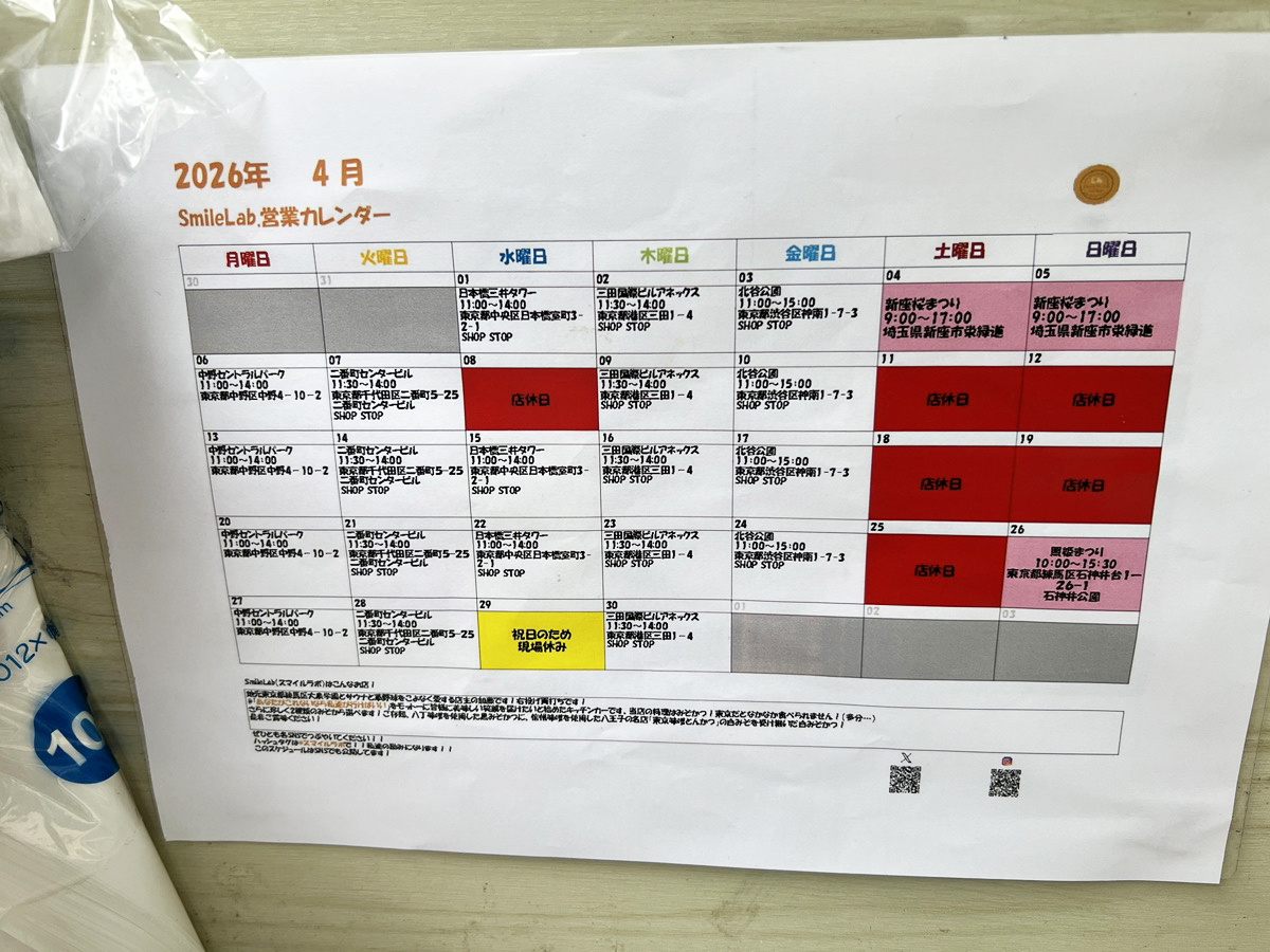 店頭のスケジュールを見ると、2026年4月現在は月曜日は中野セントラルパーク、火曜日は千代田区の二番町センタービル、水曜日は日本橋の三井タワー、木曜日は三田国際ビルアネックス、そして金曜日に渋谷に出店している様子。