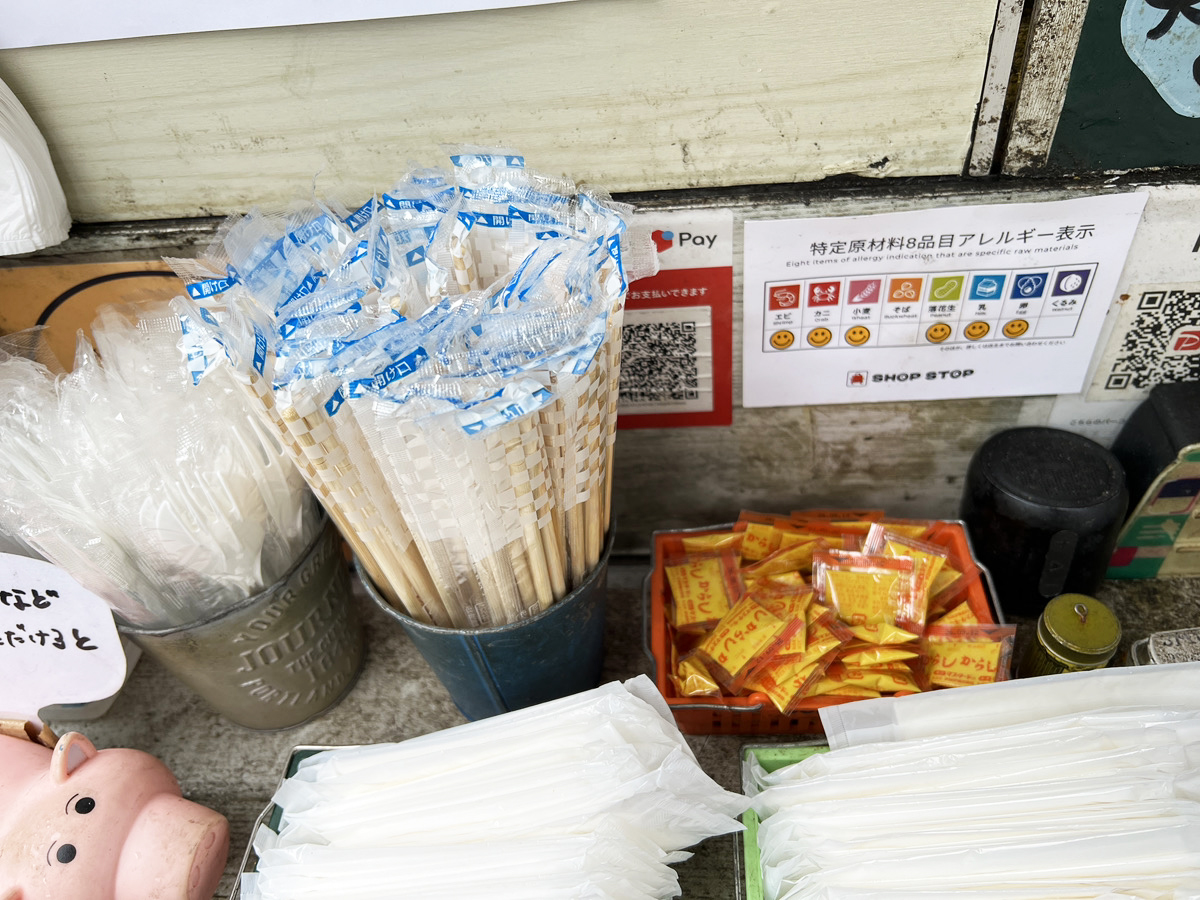▼調味料のコーナーにはからしの小袋や七味唐辛子がある