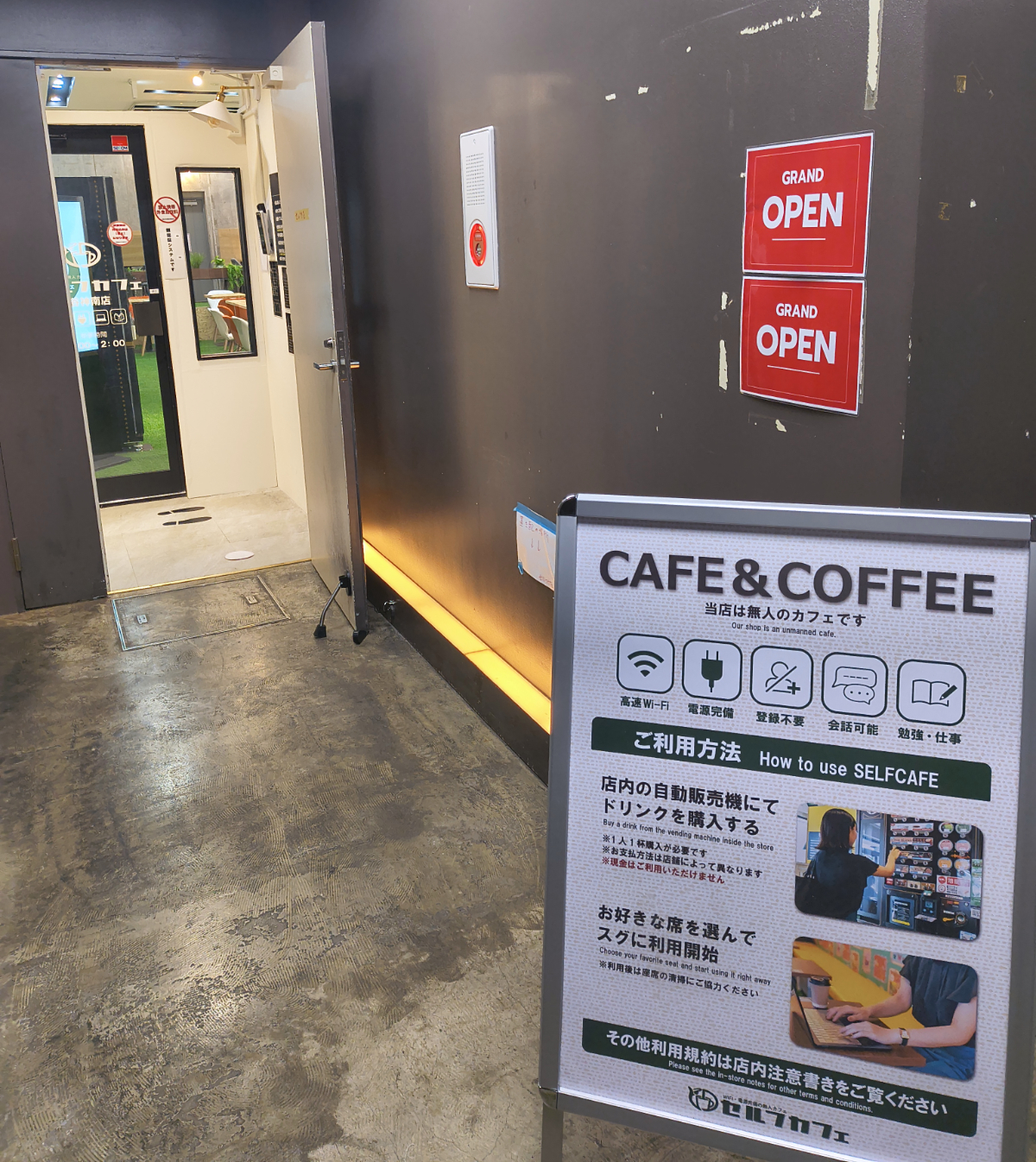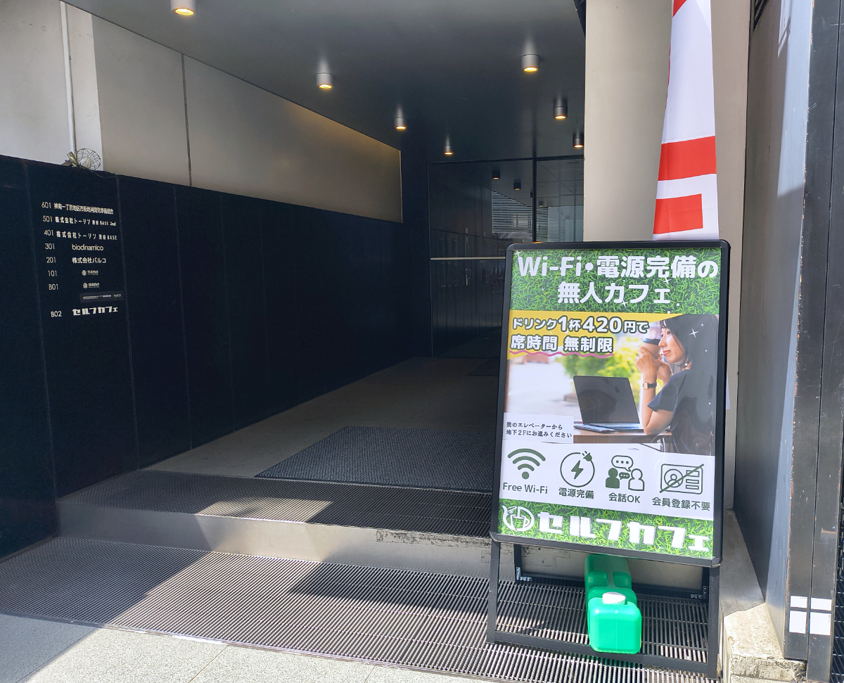 スマホの地図アプリを頼りに住所地にたどり着くと、そこはごく普通のオフィスビル。入り口に「Wi-Fi・電源完備の無人カフェ」という看板がなければ、ここにカフェがあるとは到底気づけないだろう。