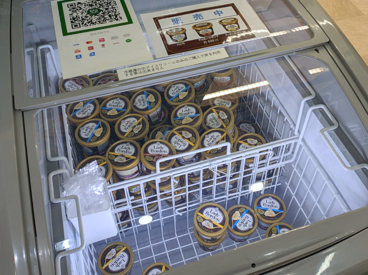 ちなみに自販機の横にはレディーボーデンのアイスまで売っている。けど、アイスのみの購入では席利用が認められないようなので、その点も気をつけよう。