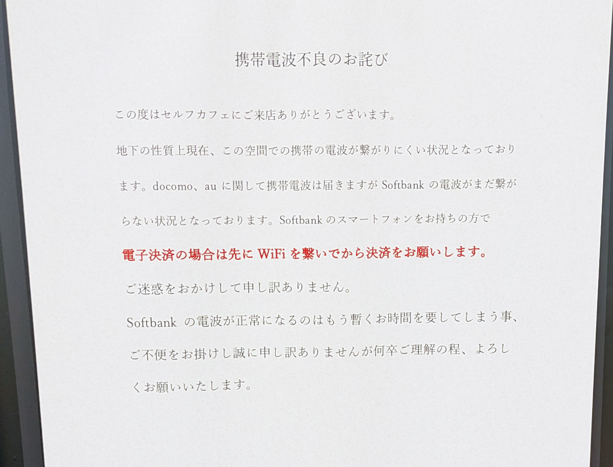 注意点として、支払いはキャッシュレスのみであること。また地下という性質上、一部の携帯キャリア(Softbankなど)は電波が入りにくいらしい。壁の貼り紙にもある通り、繋がらない場合は店のWi-Fiを利用すると良いようだ。